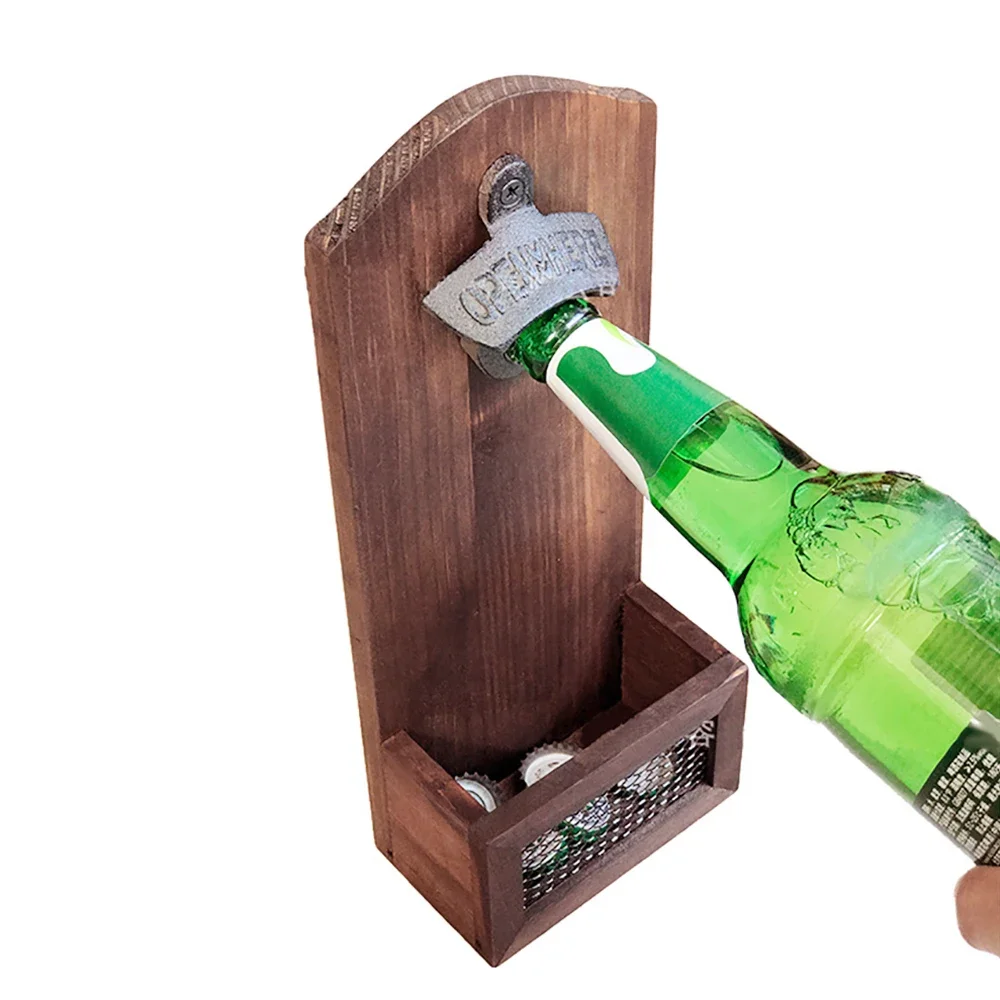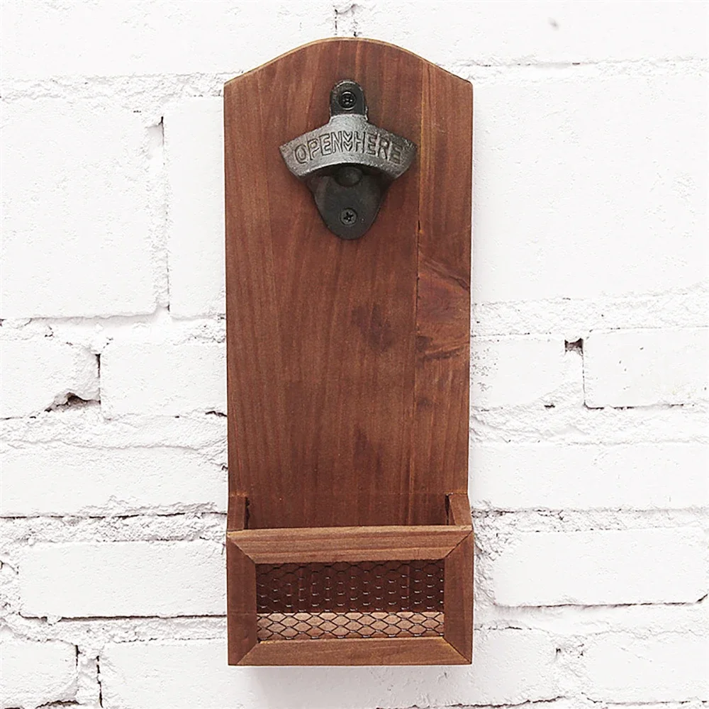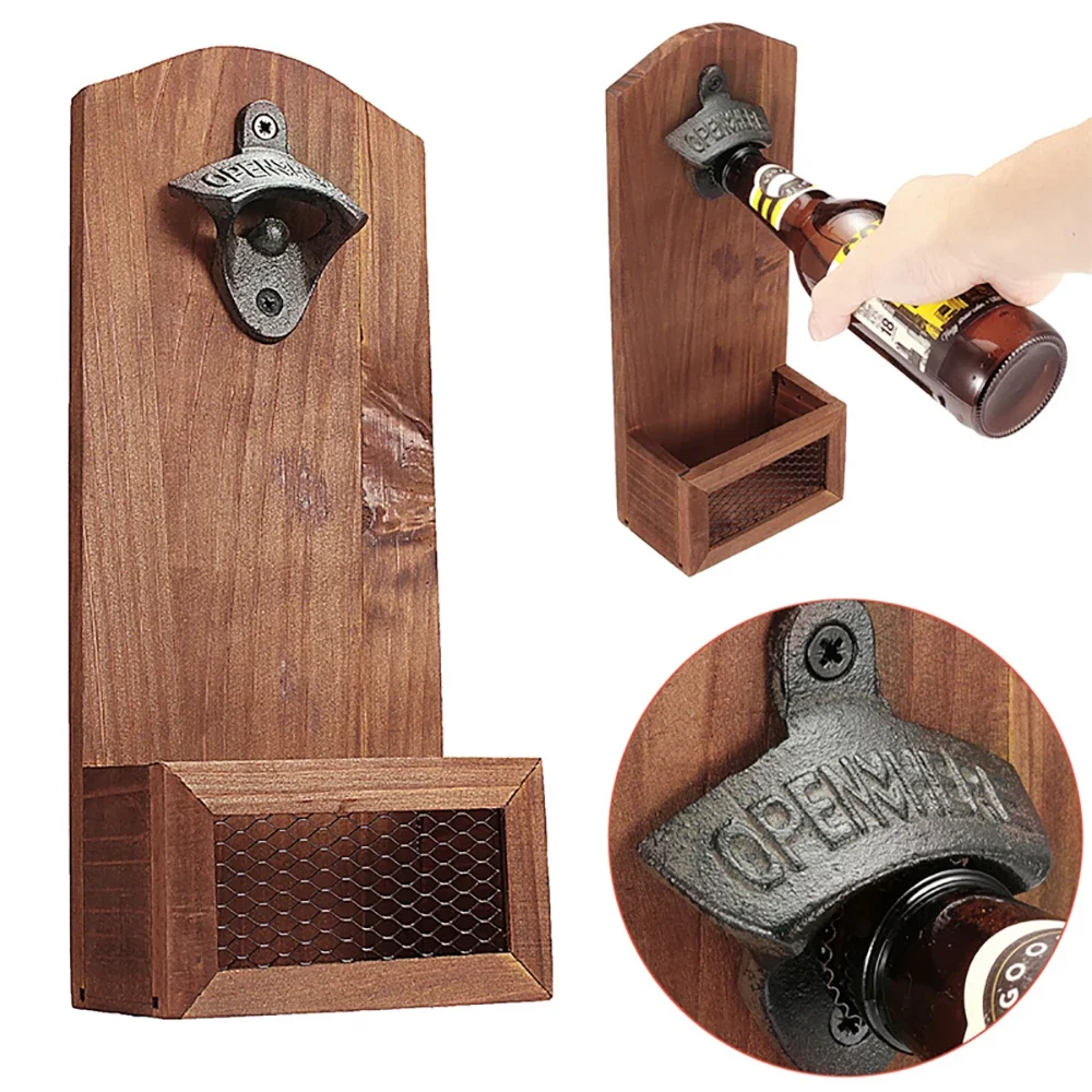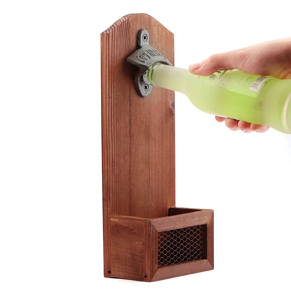 Vintage Bottle Opener Wooden Wall Mounted Beer Bottle Opener with Cap Catcher for Beer Lovers Household Kitchen Bar Tools